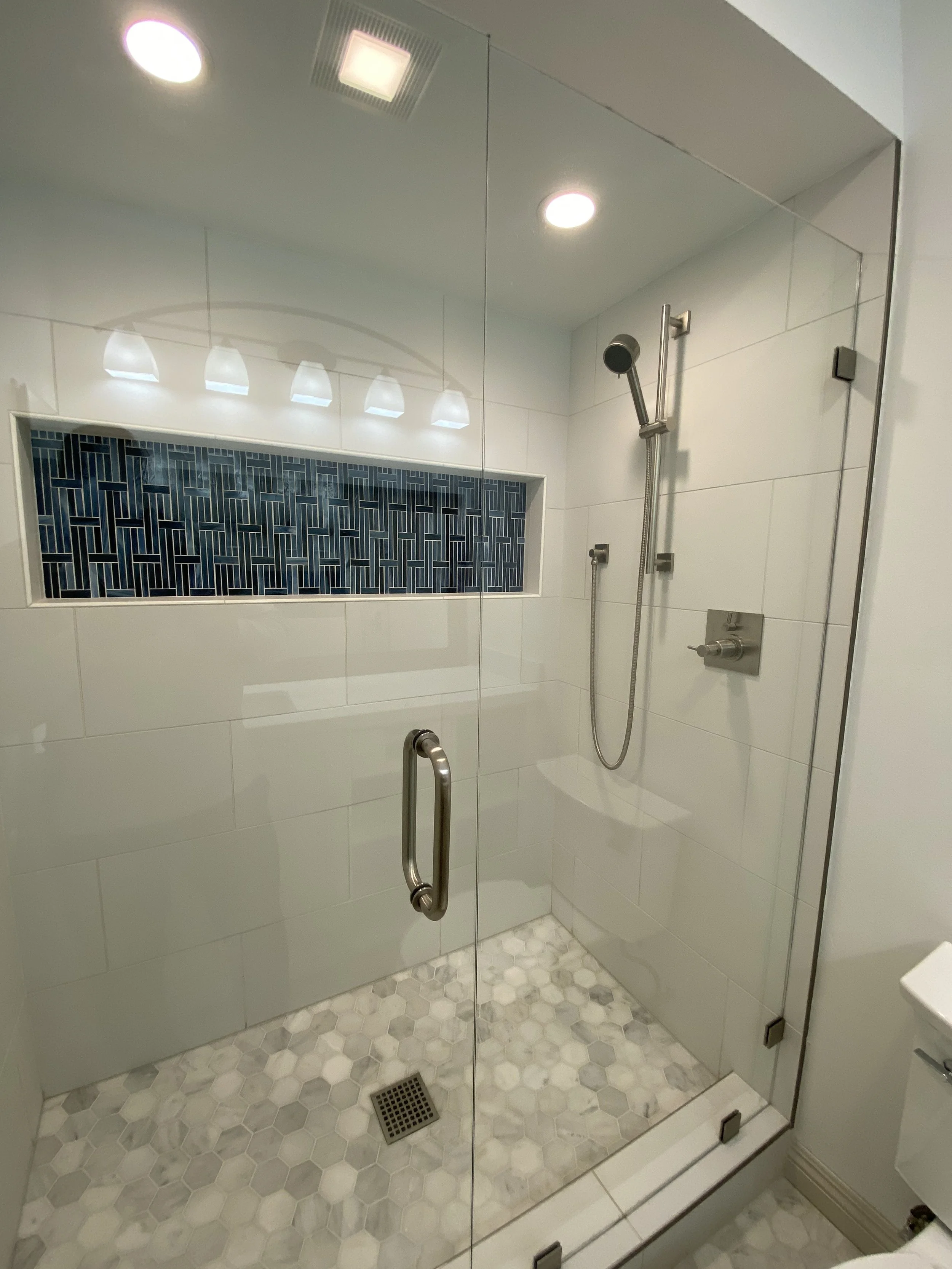The black hexagonal ceramic tiles topped by the basket-weaved design bring a distinct touch of serenity reminiscing of a Nordic waterfall. The plumbing is a nice final touch.