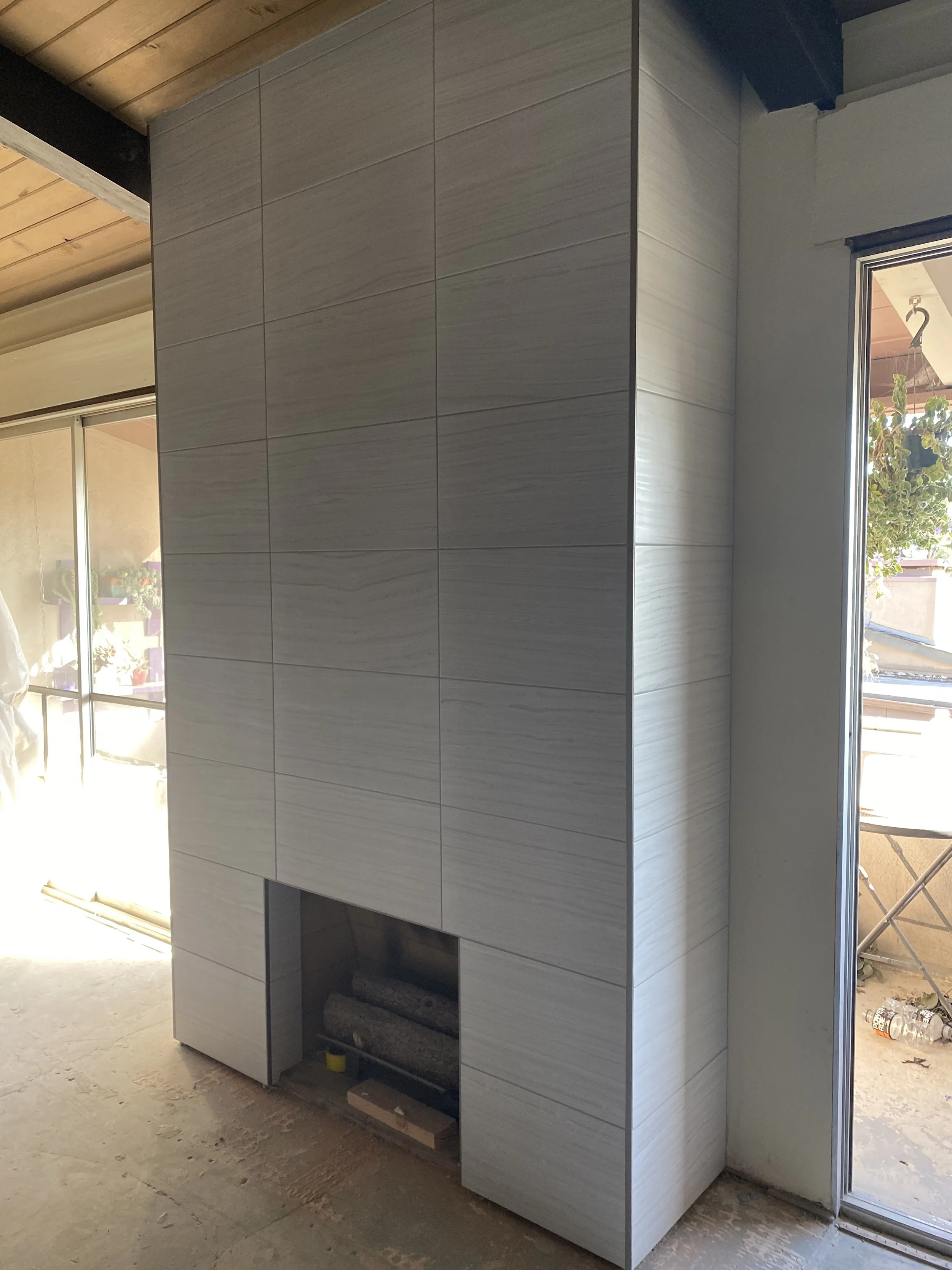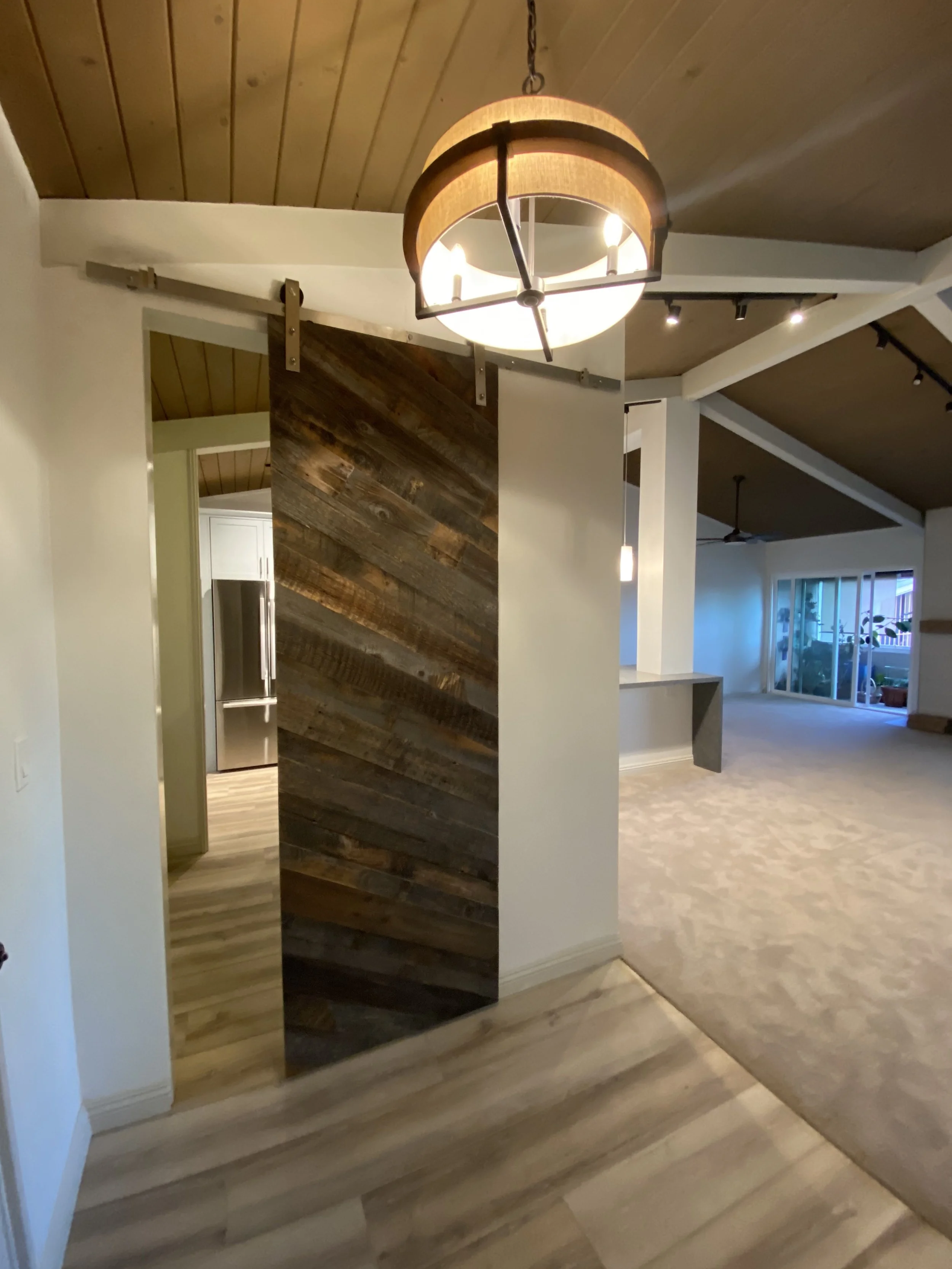 Opening up the space is always a good answer for a young couple planning on starting a family. You want to bing warmth and welcoming vibe as well as build a comfortable nest. A warm tainted tongue&groove ceiling with white beams echoing the reclaimed barn door. Shaker-style cabinet doors and drawers with caesar stone countertops. Light blue perimeter cabinets with ceramic-style slab backsplash and stainless steel appliances. 12 x 24 horizontal ceramic tiles covering the fireplace from floor to ceiling for a modern touch. Interior styling comes next